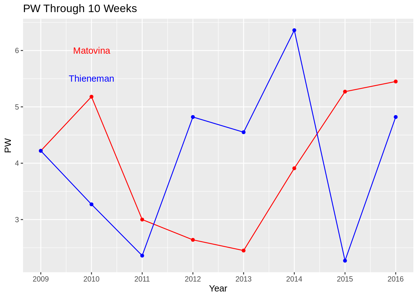 As an aside, some of the Matovina and Thieneman teams in the past have been complete stinkers. Look at the five worst teams (by PW) through 10 weeks in league history:
